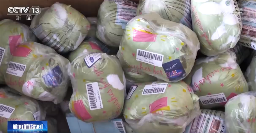忙碌的不仅是生产车间,在发货区,毛绒玩具的打包工作也在紧锣密鼓地进行。企业负责人和记者说,今年春节前的订单量同比增长超过200%,呈现出爆发式增长态势。